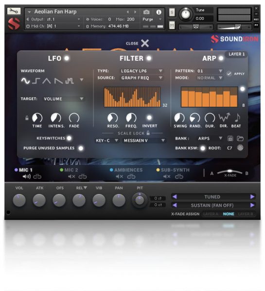 This library comes with an adaptable LFO system, with selectable LFO shape, modulation target parameter, speed, intensity, tempo-syncing and fade-in time. You can also apply your choice of 12 lowpass, high-pass and FX filters, with assignable modulation targets such as velocity, modwheel, expression, after-touch, key position and step-sequencer table control. Our customizable arpeggiator offers a velocity table and control over arp direction, timing, swing, randomization and duration. We’ve included a key and scale lock system to constrain your notes to common scales and keys for easy melodic composition and live performance.