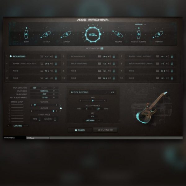 Axe Machina is a powerful multi-sampled virtual electric guitar library designed for unleashing pure metal destruction. Craig Peters sampled his custom Kiesel Aries multi-scaled 7 string guitar, tuned to A Standard. This instrument features 24 frets, a swamp ash body, birdseye maple neck, Guitarmory Polaris pickups with D’Addario XL 10-64 gauge strings. The swamp ash body has a unique style and flavor, along with a robust natural tone and resonance.