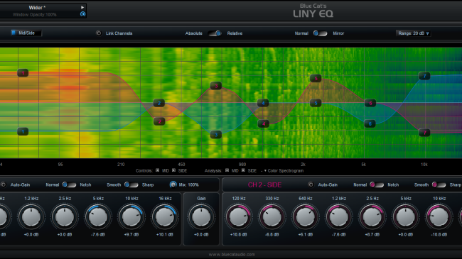 Blue Cat’s Liny EQ is an 8 bands linear phase equalizer with very low latency and comprehensive visual feedback: thanks to its highly optimized linear phase kernel, it processes the signal without phase distortion, with an unusually short latency (less than 3 milliseconds).