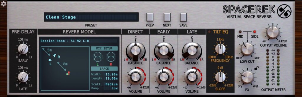 114 stunning Reverb Models – Spacerek’s expansive roster of modelled rooms lets you summon up vivid virtual stages of many kinds – from booths, chambers and halls to tunnels, chapels and towers – and switch between them at a click. Each room takes in multiple microphone and speaker configurations, too, for a total of 114 different Reverb Models, covering all your mixing and sound design bases.