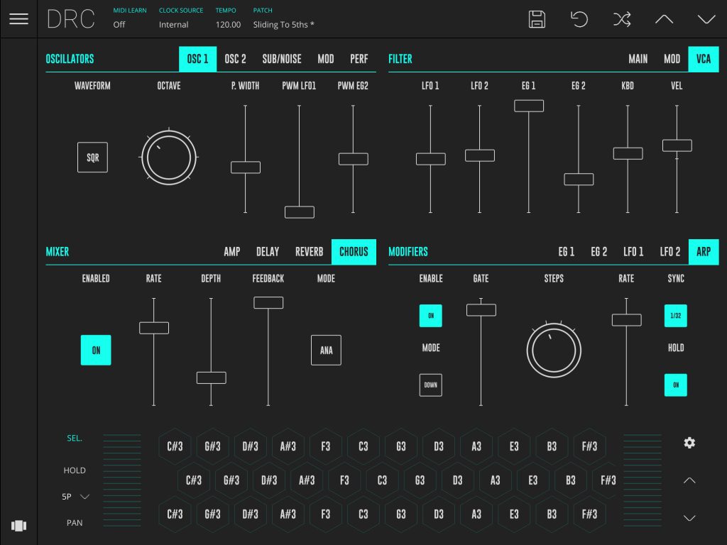 DRC is a powerful virtual analog polyphonic synthesizer that recreates the characteristic sound of an analog synthesizer providing a minimal but powerful set of parameters, for limited but incredible sonic capabilities.