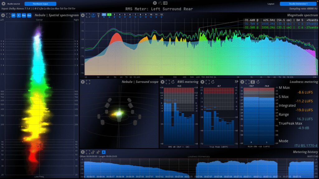 The unique FLUX:: Nebula visualizes the spatial sound field in a scope spectrogram for multichannel analysis in up to 24 channels.