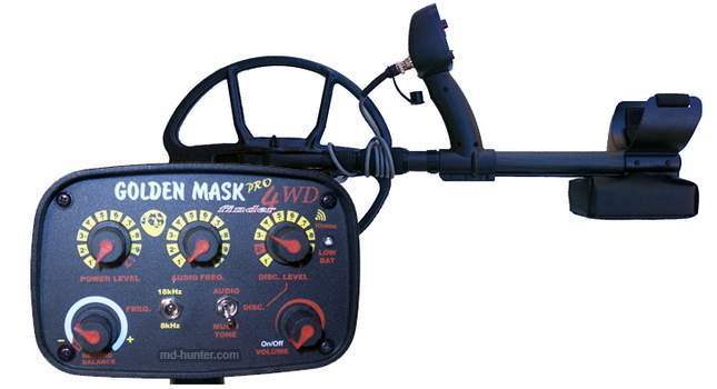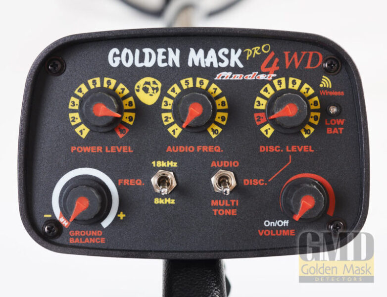 Golden Mask 4WD is an universal metal detector, running at two frequencies – 8 and 18 kHz, with integrated wireless transmitter and possibility to use wireless headphones. At 18kHz the machine works just like the 4Pro, while at 8 kHz it is similar to the GM3. The detector has super-fast recovery speed for searching in trashy areas, especially if equipped with a small-size search coil like the new 18 cm or 23 cm Spider coils.