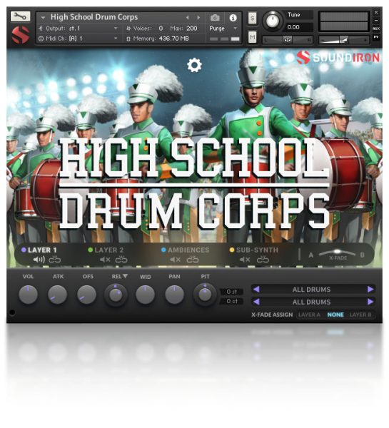High School Drum Corps is a multi-sample drum library focused on the powerful, tight sound of a small marching band drum line. There’s a certain unique punch to the hard mid-tones and truncated dry snaps of marching snares and bass drums. It’s quite distinct from the solid, pleasing punch and smooth resonance of typical rock, jazz and symphonic percussion – these drums are meant to be heard loud and clear from a great distance, delivered with the staccato snap of a military formation. Mike was a marching percussionist back in his youth. To record this library, he returned to his old alma mater many years later to capture the feeling and sound of playing in a small marching drum corps live and in the flesh. Our goal was not simply to sample the sound of watching the band from the bleachers, but to put you right there in the drum line yourself, all the way from the rehearsal hall to out onto the field on game day. To do that, we recorded the drum line in both a large indoor band hall and an open-air outdoor football field environment to provide you more freedom and really put you right in the action. The hall has a live room wetness, while the field position has a much drier sound, with a subtle echo and natural environmental background.