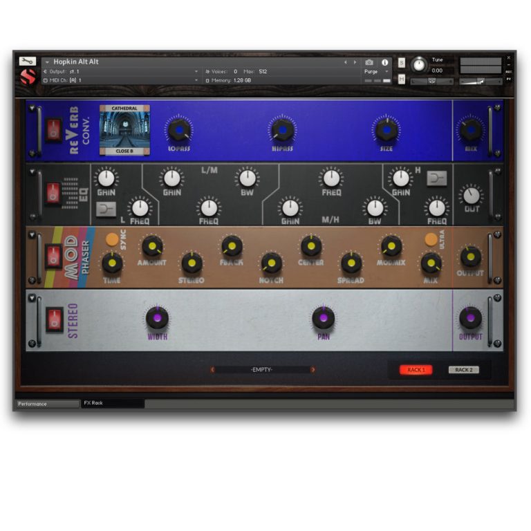 The interface is rounded-out by our modular FX rack panel, with 27 different DSP effect modules that you can assign in any of 8 available slots, in any order that you wish. You’ll find classic phaser, flanger, delay, distortion, amp and cab simulators, compressors, EQ, rotator and so much more. The Reverb effect includes our favorite convolution reverb impulse responses, including 99 different rooms, halls, chambers and outdoor environments, plus another 40 custom FX impulses to radically transform the sound and open up whole new worlds of musical possibility. We’ve added a great bank of FX rack chain factory presets to get you started!