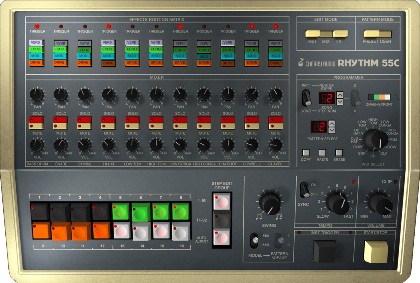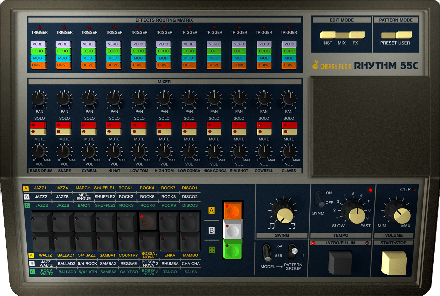 Cherry Audio’s KR-55C is a supercharged, best-of-both-worlds software emulation that combines features from two lesser-known drum machines of the post-punk era: Korg’s “Rhythm 55” KR-55A and KR-55B. KR-55C boasts all the rhythms from both models, for a total of 240 factory patterns, intros, and fills. Additionally, it adds 200 original patterns and kits that cover a wider range of genres. KR-55C’s user interface shifts based on whether the A or B model is selected and includes extra pages that let this beatbox “step out” even further. It features a familiar X0X-style 16-button layout for step-editing and real-time pattern programming, as well as a song mode for chaining up to 99 patterns.