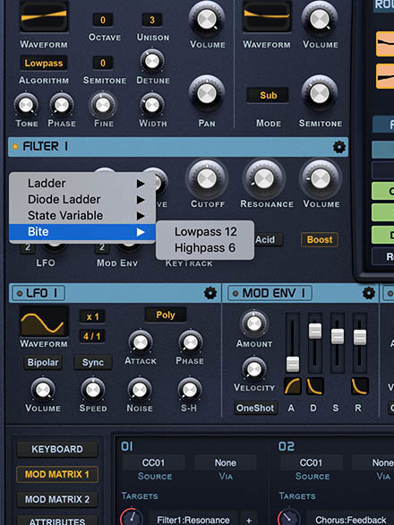 Ladder: Low 12, Low 24, High 12, High 24, Band Pass, Band Stop