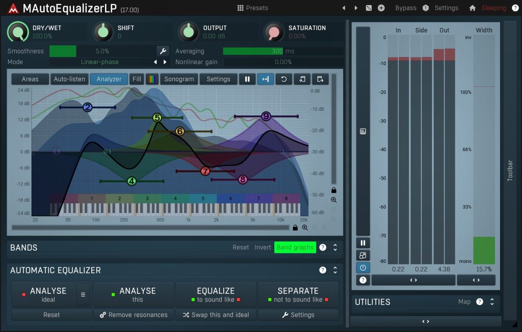 Analyze your track, select what you want it to sound like and let the plugin do the magic. It will set up the equalizer bands for you! Unlike traditional spectral matching, here you have no latency and amazing sound quality!