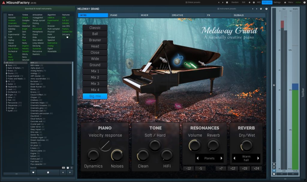 Meldway Grand comes with 7 stereo microphones with various controls for each, from volume to formants and detuning. First, there’s the classic mic stereo pair, which just works every time and is perfectly centred and wide. If you have ever played such a magnificent piano, you know the indescribable feeling of being surrounded by the wall of the piano sound. That’s what the head mic simulates, and it’s as close as it gets to getting that feeling with the current technology. Then there are the 2 pairs of ultra-close mics for the “in your face” sound often used in pop and rock. Ball mic is kind of like the head but inside the piano. Brauner mics produce the widest stereo image you could get from a piano. And, of course, we experimented too – a pair of mics on the ground? That cannot work! Well, it does, apparently!
