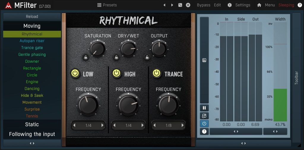 Whenever you need to add some movement to an otherwise static sound, a filter is one of the first processors to try. MFilter can probably do more than you could imagine a filter would be capable of.