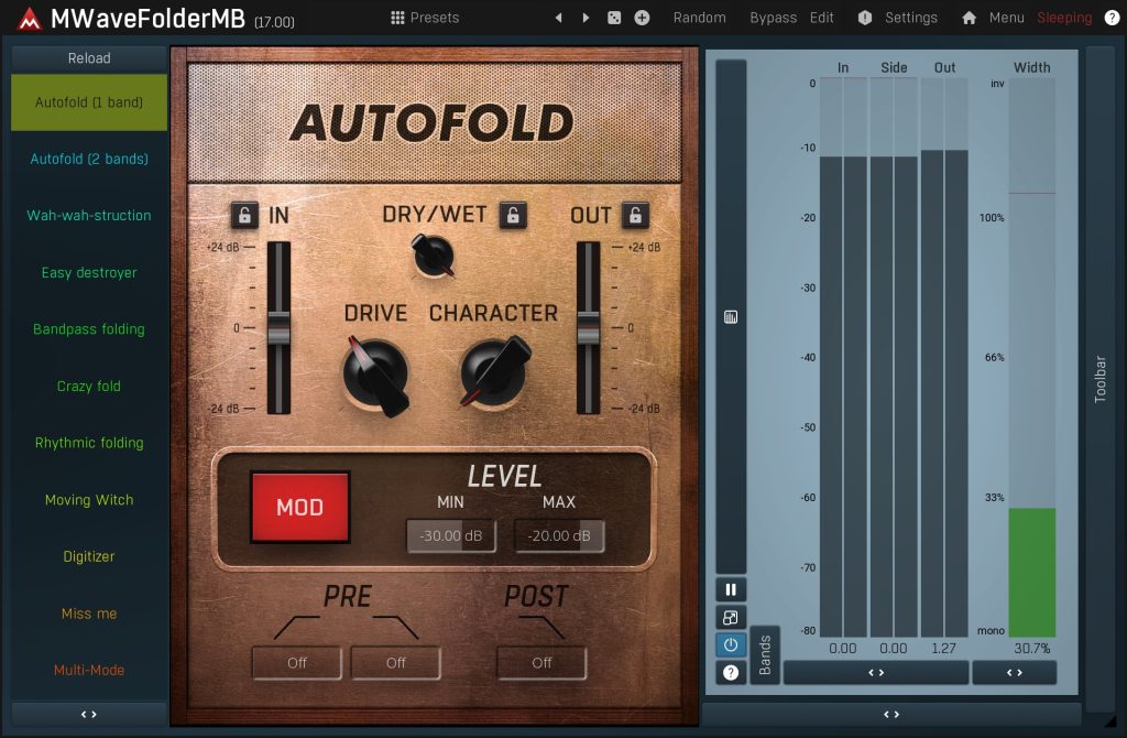 Distorting a broadband signal may be useful, but it’s usually too overpowering and doesn’t give you many options. MWaveFolderMB lets you split the input signal into up to 6 bands and use a different custom shape in each of them. You can even modulate the shapes for real distorted madness.