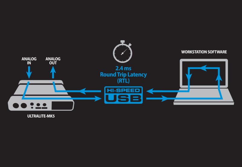 Optimized drivers for both Mac and PC deliver ultra-low latency performance. With a high-performance DAW such as Digital Performer, the UltraLite-mk5 delivers an astonishing round trip latency (RTL) of 2.4 ms (milliseconds) over USB (at 96 kHz with a 32-sample host buffer).