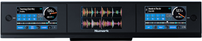 Two of the screens provide moving waveforms, playhead, deck, and FX status. The third central screen gives you a dedicated view of your track library. But this is really great—this third central screen can also be switched to display stacked parallel waveforms for complete beat matching control of your active programs. Now, you can manage all your critical performance elements with the source laptop out of sight or closed altogether.