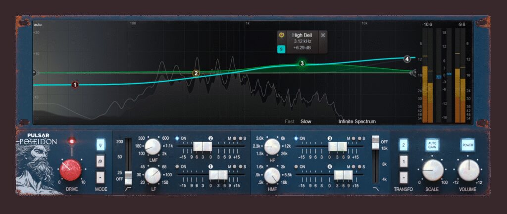 With such an idiosyncratic EQ, there’s a learning curve. The interactions between its bands are so unique that we’ve never seen a digital reproduction that makes them simple to use. So we decided to nail it ourselves with an on-screen EQ curve that reacts faithfully to the quirks of the original hardware, making Pulsar Poseidon easy to master.