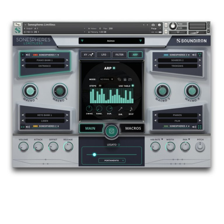 You can set up dynamic arpeggiator, gliss, and strum patterns with our integrated ARP system, featuring a suite of abilities like rhythm, direction, swing and randomization. The Legato feature is also included, instantly turning this machine into a monophonic legato/portamento instrument with adjustable pitch bend speed control. Dive in to tweak and automate every parameter with total control over every detail, or just hit the Random button to instantly generate an infinite variety of new sound, parameter and dynamic modulator combinations. The Macro knobs to the left and right of the XY Pad can be assigned to modulate a variety of layer sound shaping controls or FX rack plugins.