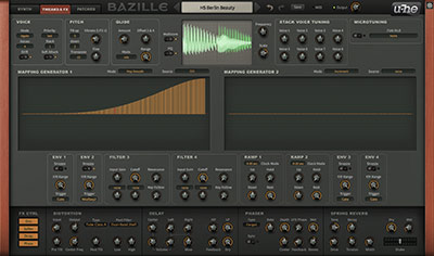 Since the 4 main oscillators have a frequency range which starts at zero Hertz, they can be used as synchronized or unsynchronized LFOs or also adopt custom shapes thanks to Bazille’s mapping generators. The oscillators are also capable of all kinds of FM sounds by plugging an audio-frequency source into the phase modulation input.