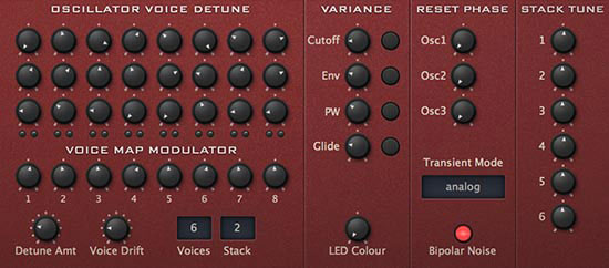 The Trimmers panel is where you can make your sounds feel more analogue. Control voice detuning per oscillator, adjust variance between individual voices (round robin), voice drift and more—adding life to your music. These options mirror the inherent variations in analogue hardware. As the circuit boards are not always 100% the same (due to component tolerances), oscillator tuning may differ slightly, some envelopes are a little less snappy. The individual effects may be subtle, but they add up to a more authentic analogue sound.