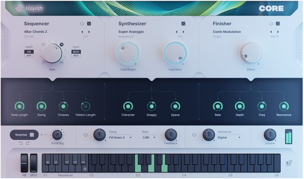 Usynth features a built-in Delay unit that’s simple to set up, yet super-flexible. Instead of a dozen parameters you have to set, simple and complex Delay configurations are already prepared – all you have to do is select a Delay preset and adjust Mix and Feedback.